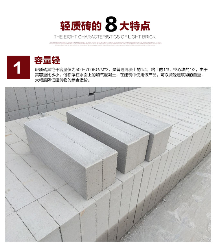 容量輕:輕質(zhì)磚其絕干容量僅為500-700Kg/m*3,是普通混凝土的1/4,粘土的1/3,空心塊的1/2,由于其容重比水小,俗稱浮在水面上的加氣混凝土,在建筑中使用該產(chǎn)品,可以減輕建筑物的自重,大幅度降低建筑物的綜合造價。