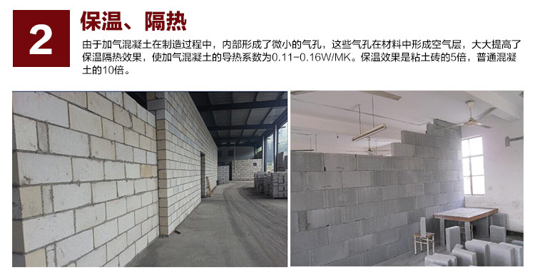 保溫、隔熱:由于加氣混凝土在制造過程中,內(nèi)部形成了微小的氣孔,這些氣孔在材料中形成空氣層,大大提高了保溫隔熱效果,使加氣混凝土的導(dǎo)熱系數(shù)為0.11-0.16W/MK。保溫效果是粘土磚的5倍,普通混凝土的10倍。