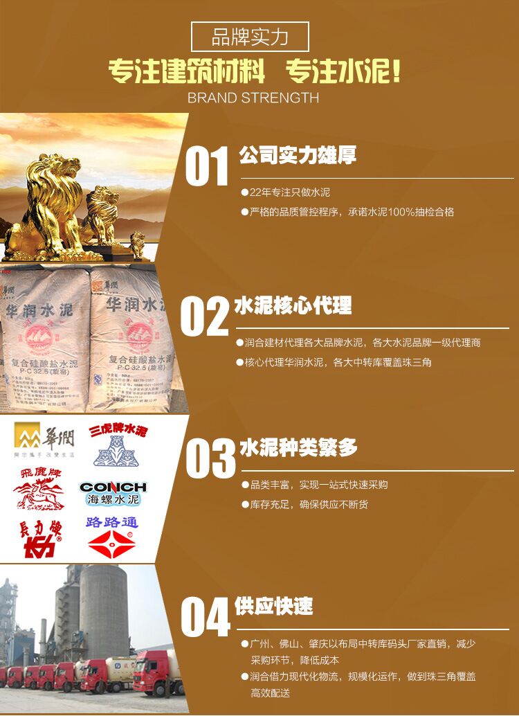 佛山市潤(rùn)合建材公司 簡(jiǎn)稱(chēng):廣東潤(rùn)合。專(zhuān)注水泥22年生產(chǎn)/批發(fā)。主營(yíng):PC32.5R、PO42.5R、P1142.5R、PO52.5R華潤(rùn)水泥、三虎水泥、海螺水泥、飛鹿水泥、路路通水泥、長(zhǎng)力水泥。及C20、C25、C30、C35、C40、等C60以下混凝土。各大水泥品牌,在水泥采購(gòu)商中享有較高的品質(zhì)認(rèn)可,廣東潤(rùn)合與多家世界500強(qiáng)企業(yè)中鐵、中交、中國(guó)建筑和知名房企保利地產(chǎn)、碧桂園地產(chǎn)、龍光地產(chǎn)、美的地產(chǎn)長(zhǎng)期合作。各品牌水泥有較大價(jià)格優(yōu)勢(shì),及水泥運(yùn)輸配送優(yōu)勢(shì)。佛山潤(rùn)合水泥建材公司,將以薄利多銷(xiāo)及全心全意服務(wù)每位客戶(hù)。